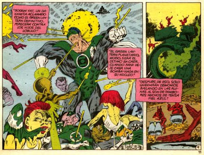 ¿Y se están preguntando a qué historia de Green Lantern se refiere Alan Moore? Es una pequeña historia de 8 páginas en la que Abin Sur ve su futuro y cuando trata de evitarlo, lo único que logra es ocasionarlo. Pueden leer de qué trata en el blog de PlusGonzo pero si quieren ver cómo DC continúa regurgitando las ideas de Alan Moore, pueden ver algunas comparaciones abajo.